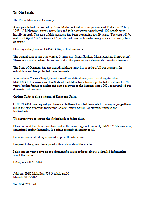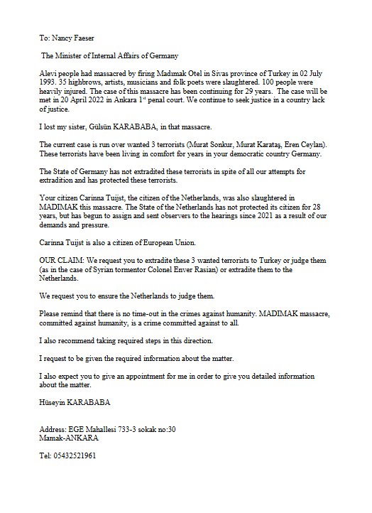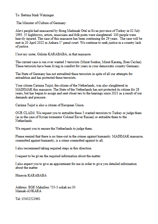 Haberler Hüseyin Karababa’nın Sivas Katliamı Sanıklarının İadesi İçin Gönderdiği Mektuplar by admin Nisan 10, 2025 written by admin Nisan 10, 2025 32 Kültür Bakanı’na İçişleri Bakanı’na Başbakan’a 0 comments 0 FacebookTwitterPinterestEmail admin previous post Karababa, Sivas Katliamı sanıklarının iadesi için Almanya Başbakanı’na mektup gönderdi! next post Mahmut Erciyas, Sivas Katliamı’nda yaşamını yitiren Carina Thuijs’in hayatını kitaplaştırdı Related Articles Kenanoğlu açıklıyor: Madımak Oteli’ndeki iki katliamcının ismine ne... Nisan 10, 2025 Karababa: Madımak’a gidip kardeşimin ismini oradan ellerimle sökeceğim-VİDEO Nisan 10, 2025 Madımak Anıtı’ndan saldırganların isimleri kaldırıldı – “Bilseydik o... Nisan 10, 2025 Sivas Katliamı davasında talepler yine mahkeme heyetince kabul... Nisan 10, 2025 MAHKEMEYE ÇAĞRI! Nisan 10, 2025 Madımak Katliamı’nı anmaktan yargılanıyorlar Nisan 10, 2025 Mahmut Erciyas, Sivas Katliamı’nda yaşamını yitiren Carina Thuijs’in... Nisan 10, 2025 Karababa, Sivas Katliamı sanıklarının iadesi için Almanya Başbakanı’na... Nisan 10, 2025 Madımak Katliamı’nın bir numaralı sanığı için ‘mezarı açılsın’... Nisan 10, 2025 Madımak’ın bir numaralı sanığı Erçakmak’ın ölümü üzerine şüpheler... Nisan 10, 2025 Leave a Comment Cancel Reply Save my name, email, and website in this browser for the next time I comment.